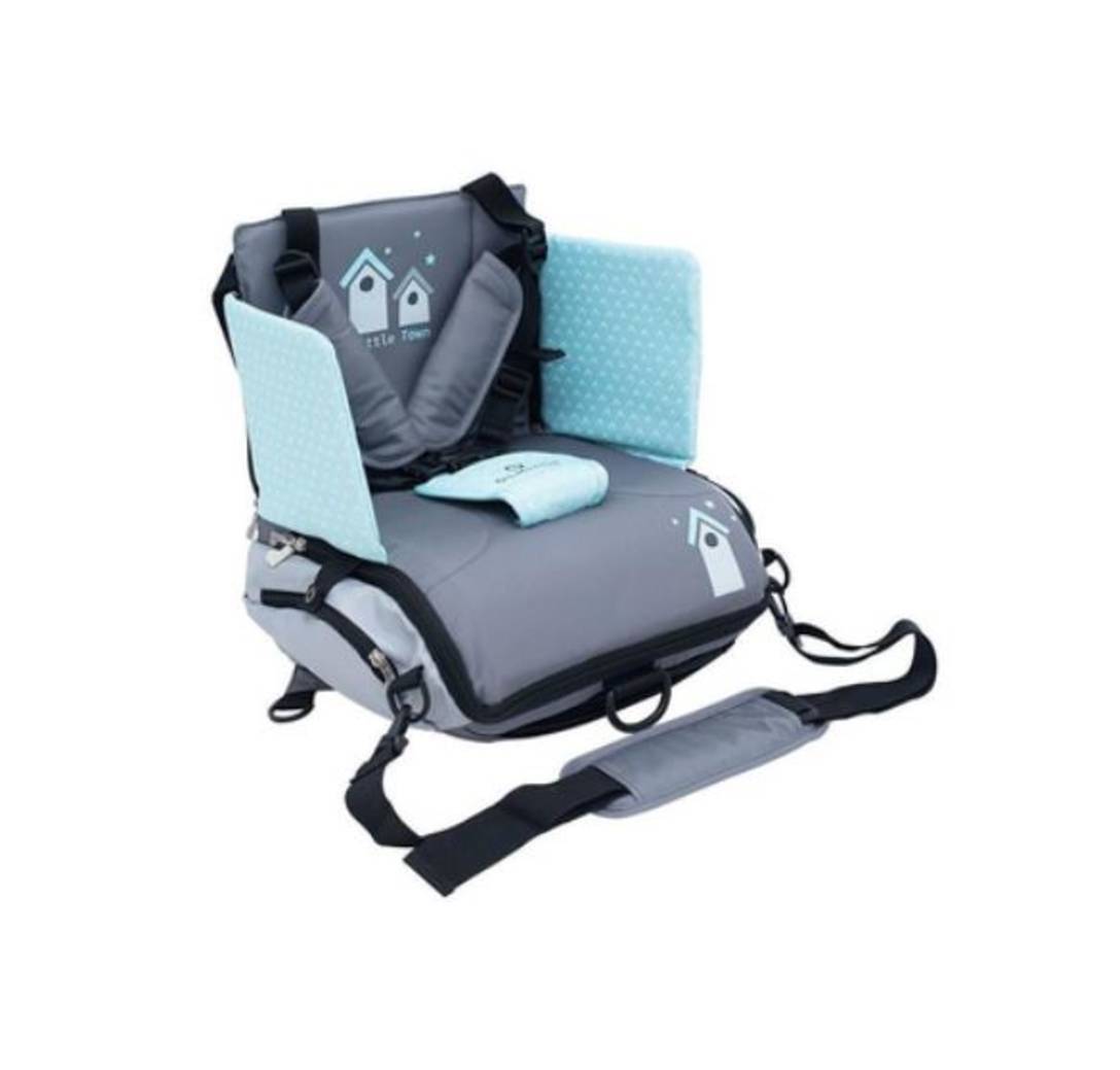 * Oinarri zurrun oso arinarekin esertzen naiz, euskarri erosoagoa izateko. Segurtasun-uhalak eserlekua aulki estandar gehienetan jartzeko aukera ematen du, eta sorbaldan poltsa moduan edo bizkarrean motxila moduan zintzilikatzeko uhal bihurtzen da. Segurtasun-arnes doigarria, haurra eserlekuan tinko eusten duena.