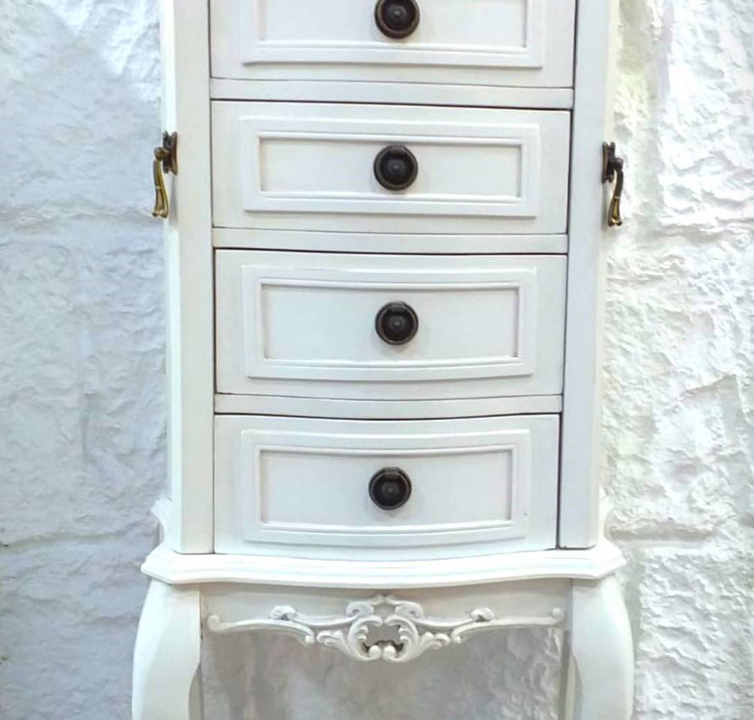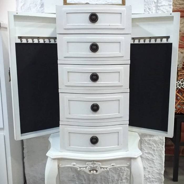 VINTAGE ESTILOKO EGURREZKO BITXI-KATXA, 5 TIRADERA ETA ALBOKO ATEEKIN LEPOKOAK ZINGOTZEKO. ERAMATEA ALTXATZEN DA BESTE BITXIA MOTA BAT JARTZEKO ZULO BAT ERAKUTSUZ ETA ISPILU BAT DAUKA. HAUTSIA ZURI ETA INTXAUR KOLOREA. NEURRIAK: ZABALERA 48cm X HAKERA 30cm X ALTUERA 101cm