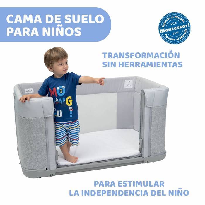 OHE BIHUR DAITEKEENA: sehaska hau zorurako ohe bihurtuko da hanka ateragarriei eta alboko panel-sistemari esker. Horrela, independentzia sustatzen da 18 hilabetetik aurrera (Montessorin oinarrituta)