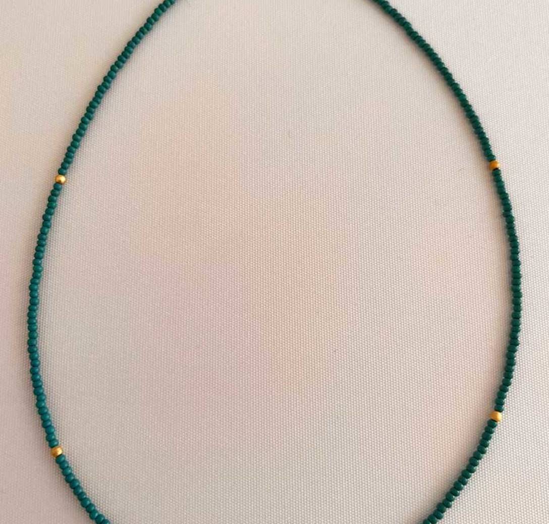 Collar de rocalla con cuentas doradas, en color azulón de 40 cm de largo con extensión.