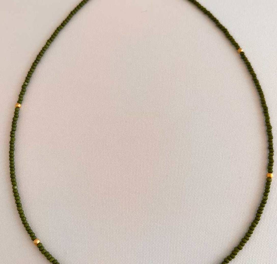 Collar de rocalla con cuentas doradas, en color verde de 40 cm de largo con extensión.