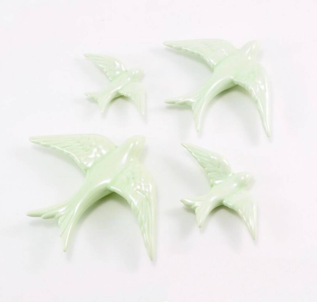 Estas graciosas golondrinas están hechas en un pequeño taller de cerámica regentado por António y Lucía, maestros artesanos del norte de Portugal. Ellos realizan cada golondrina en cerámica, utilizando un molde, y después las pintan a mano en acabado esmaltado verde menta.