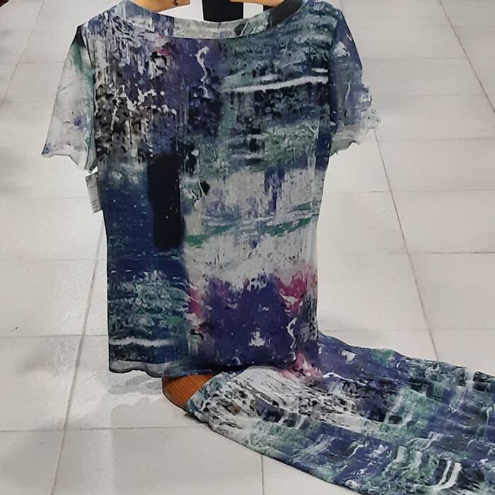 Udarako oso freskoa den konjuntoa, hainbat tonutan estanpatutako gasan egina, urdina, hegaldun gona eta ehun bereko gerrikoa dituen gorputza dira nagusi, dena % 100 poliester forratuta