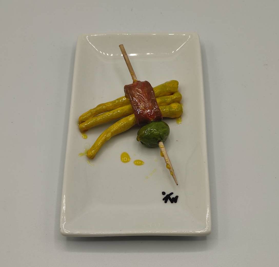 Eskuz egindako Gilda gogortutako mineraldun pastarekin egina eta zeramikazko platerean itsatsia.