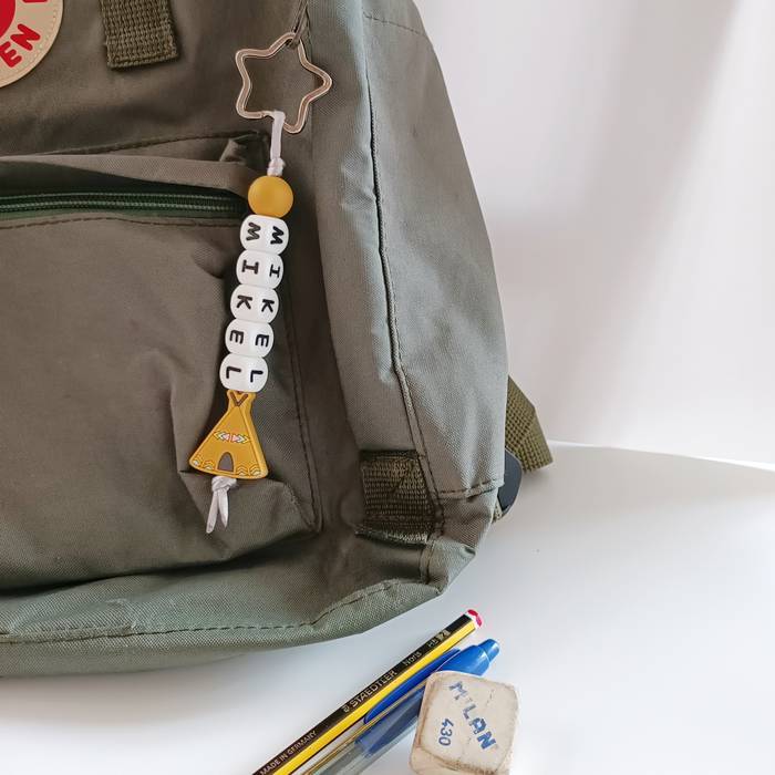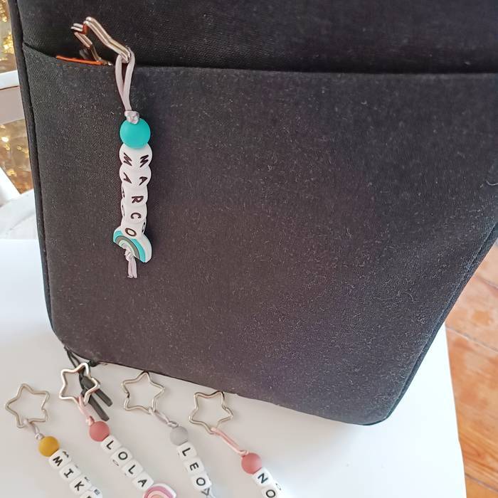 Silikonazko giltzatakoa, pertsonalizatua txikienentzat edo ez hain txikientzat. Eskolara joateko orduan motxila edo ordenagailu eramangarria markatzeko modurik errazena eta originalena.