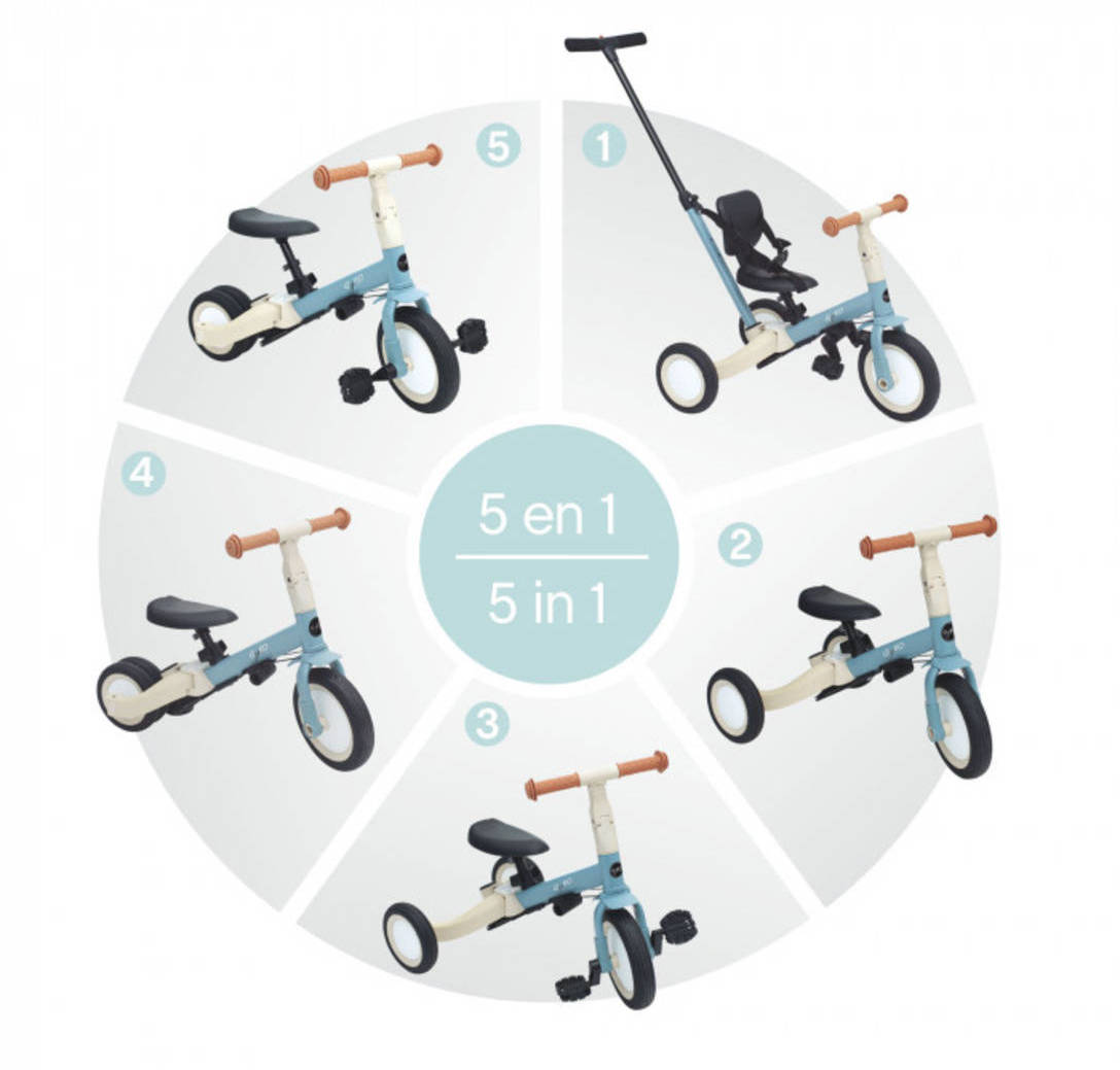 5 modu desberdinetan erabil daiteke, haurraren adinaren eta trebetasunen arabera, eta, aldi berean, bizikletan ibiltzen ikasteko aukera ematen dio.