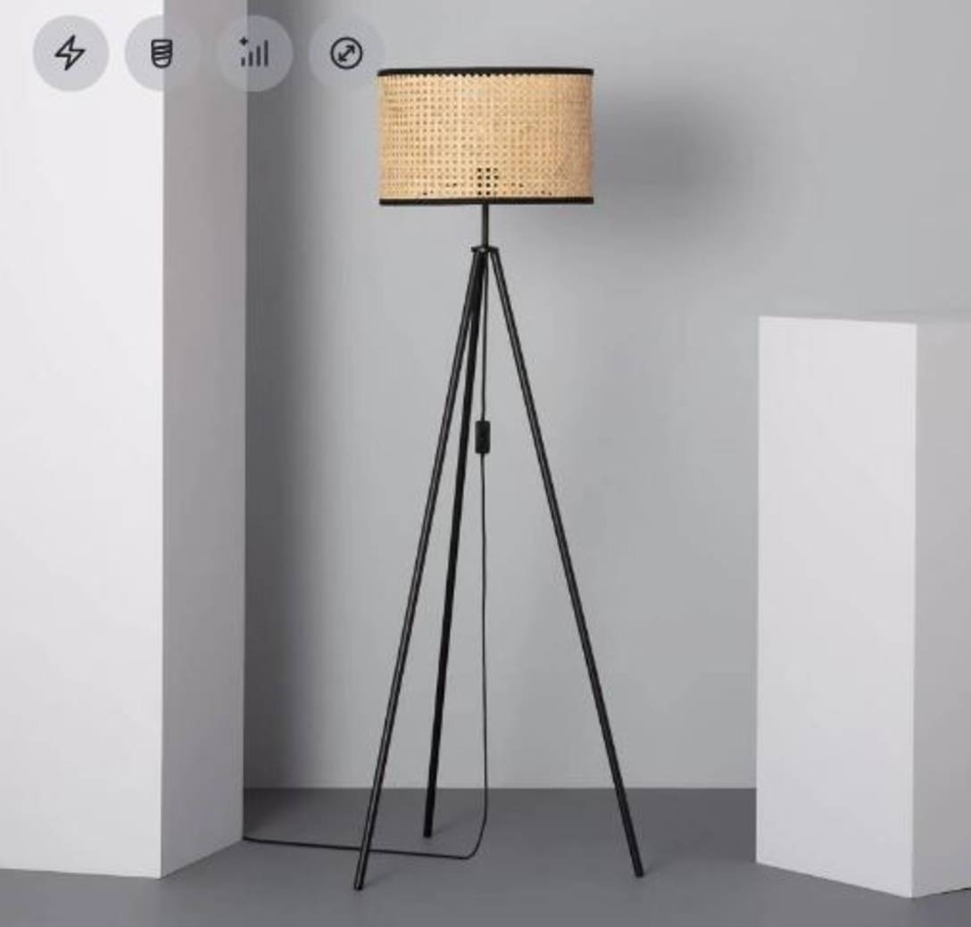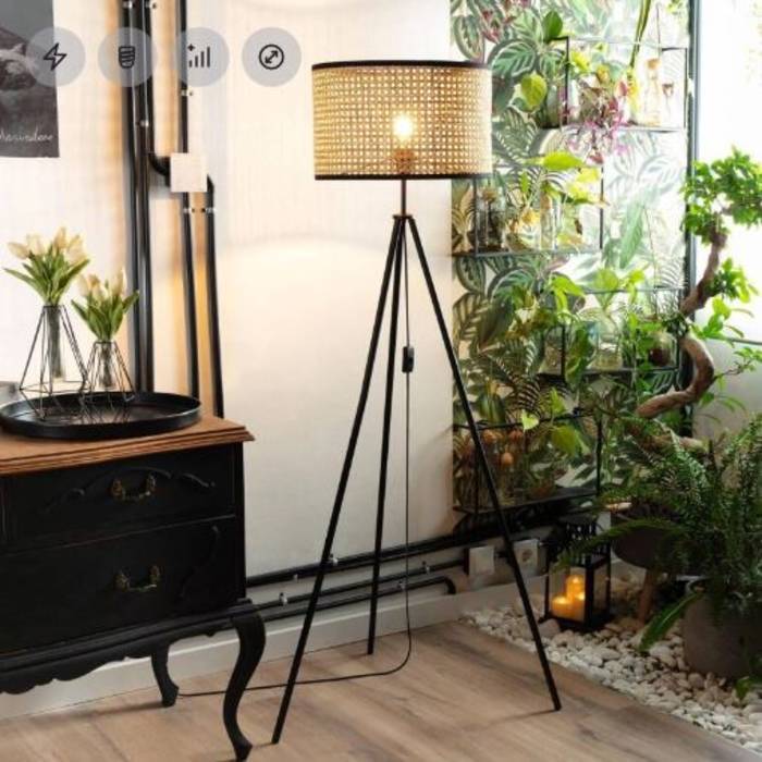 Zutikako lanpara, hiru tripode motako metalezko hanka beltzez eta rattan beixa-pantaila dituena