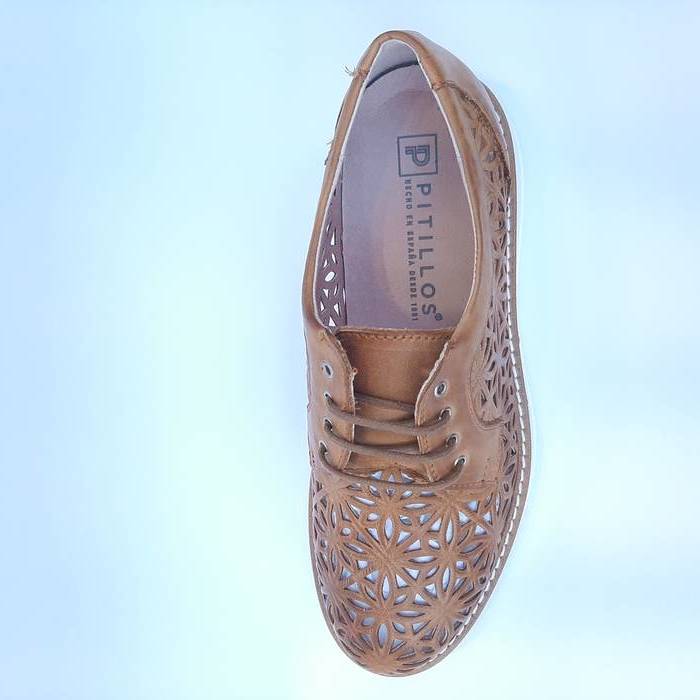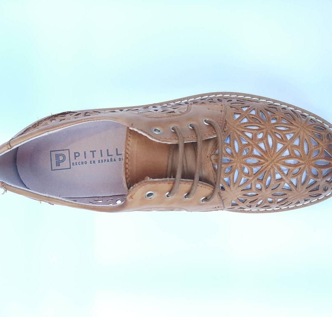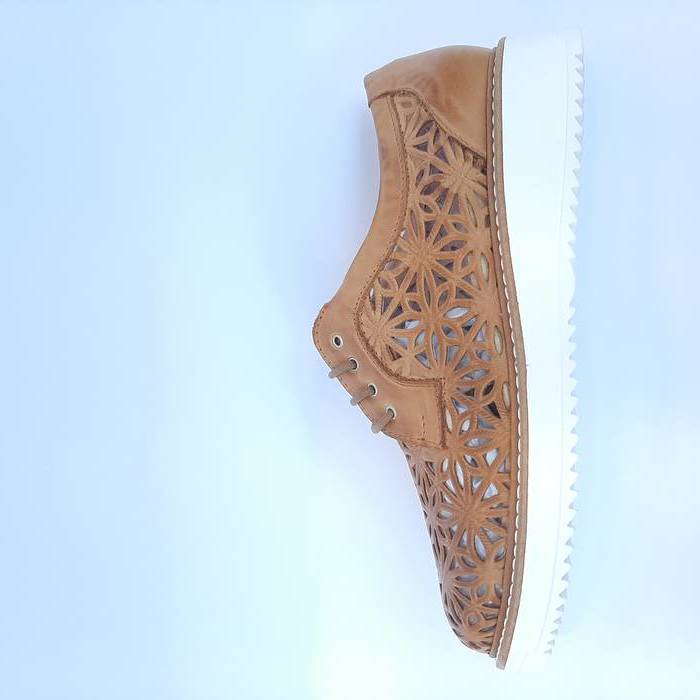 Larru koloreko oinetakoa eta zola zuria, irekidura polita du.