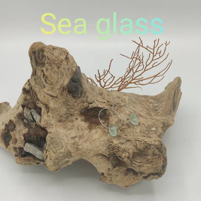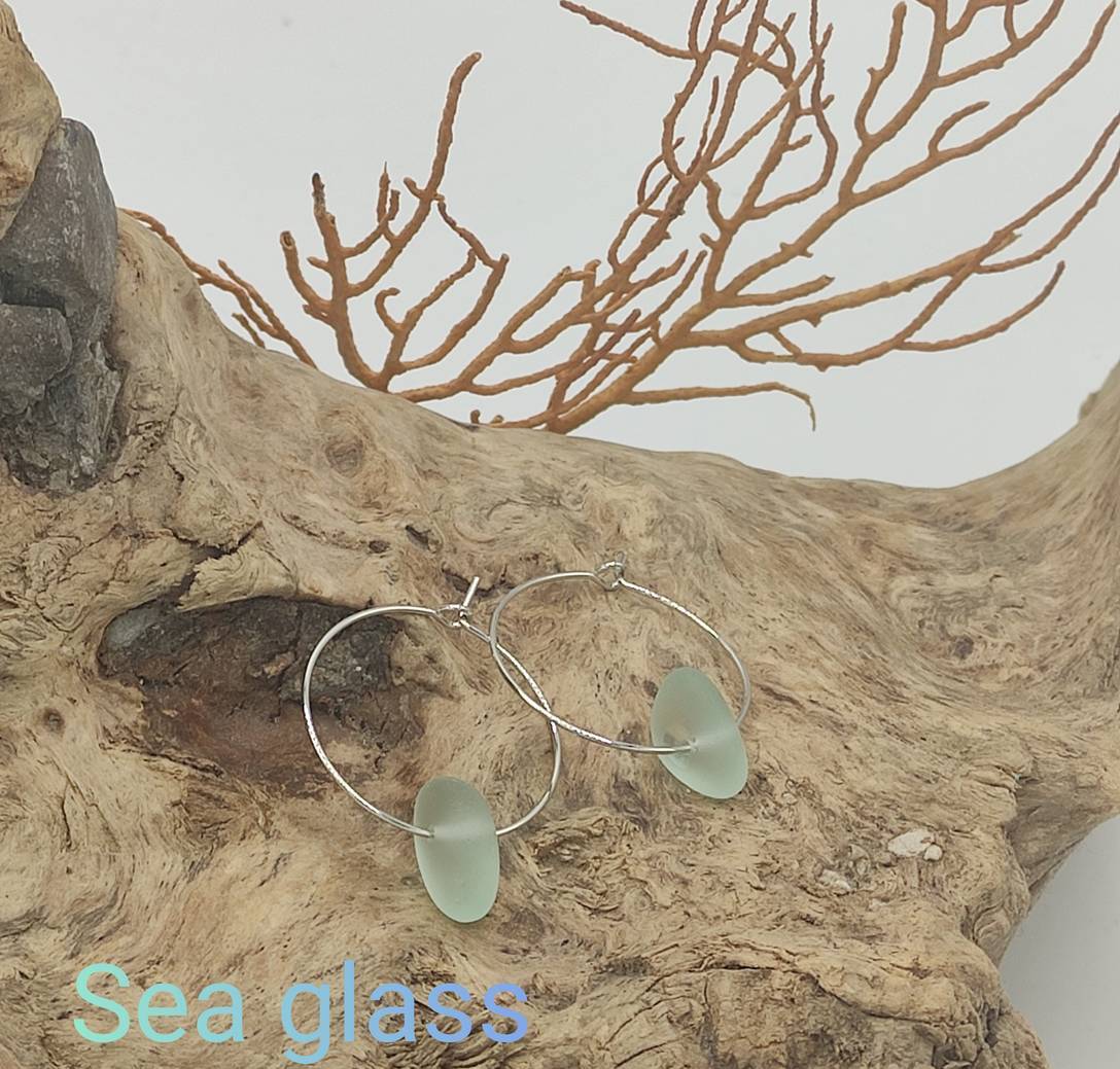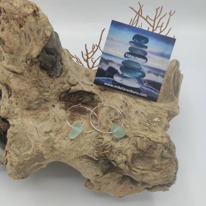 25 mmko diametroa duten altzairuzko belarritakoak. Hondartzatik jasotako birziklatutako itsas beirarekin egindakoak.