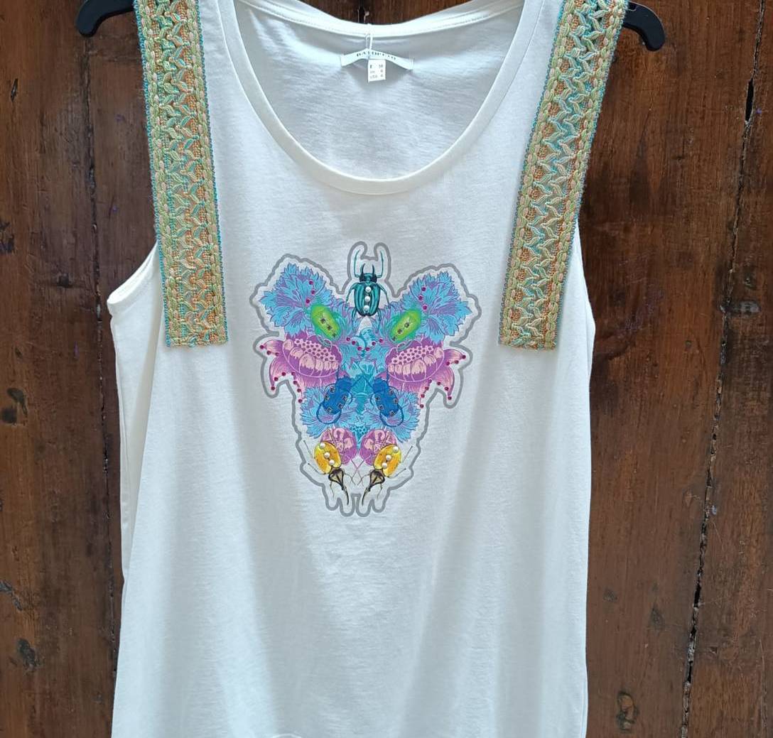 Neskentzat kamiseta, kotoia lepo biribilean txakur saltxitxa marraztuta