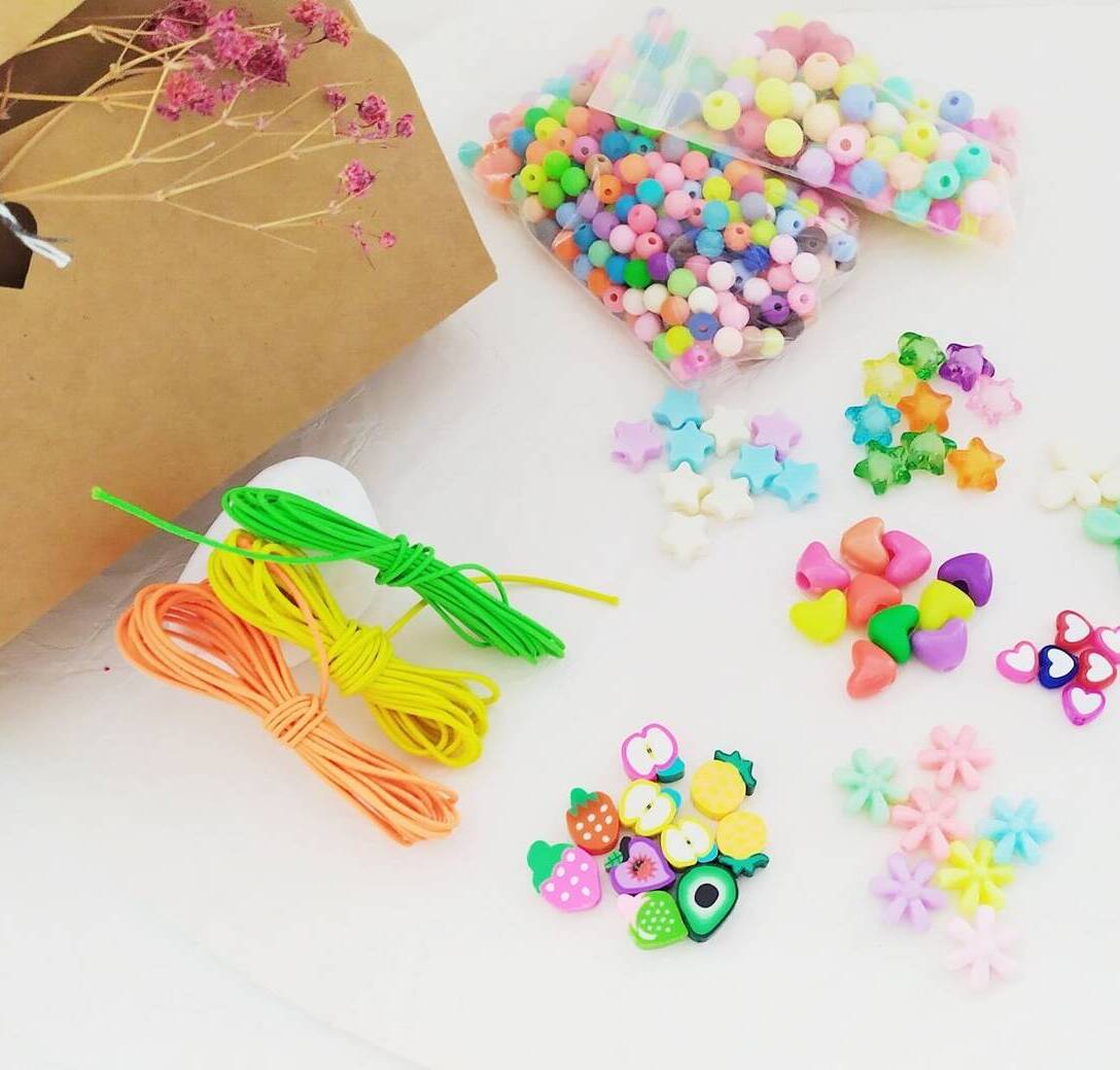 . Materiala: kalitate handiko plastikozko abalorioak, 1 mm-ko hari elastikoa kolore dibertigarrietan.