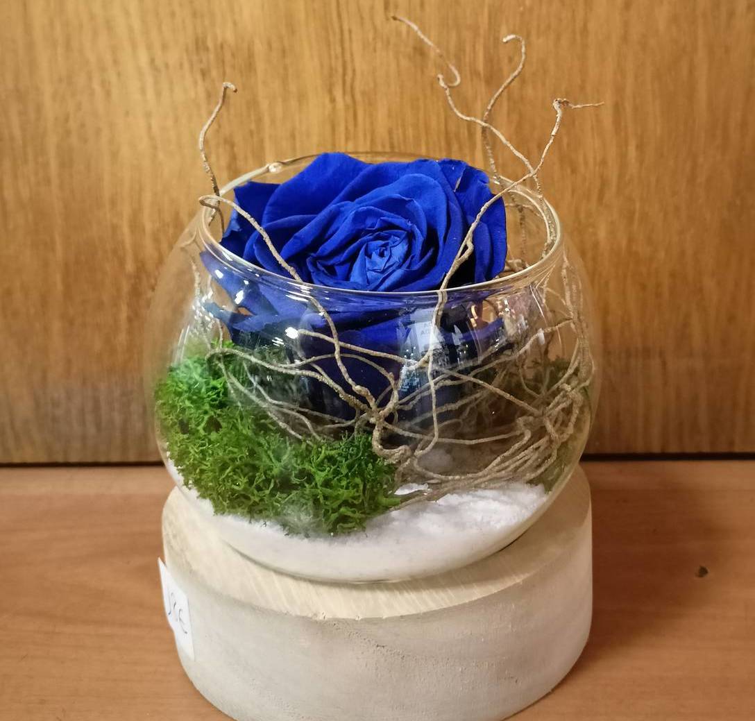 Larrosa kontserbatu txikia kristalezko ontzi txikian.