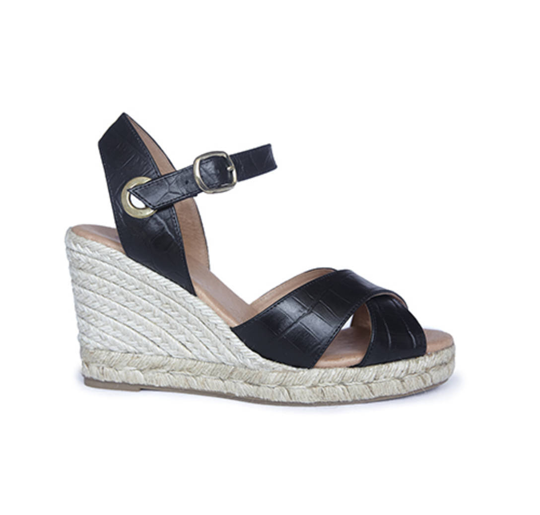 Larru beltzeko sandalia altua, eskumuturrekoarekin gurutzatua