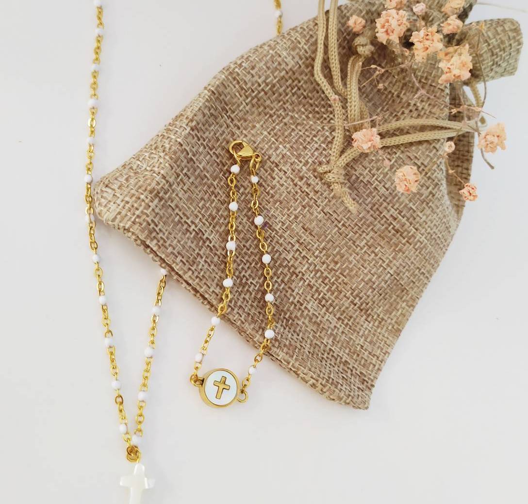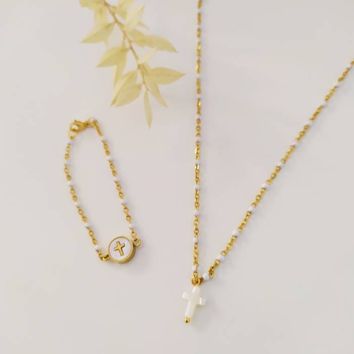 Urrezko kateko lepokoa eta esmalte zuria, nakarrezko gurutze natural polit bat zintzilik duela, charm gisa. Komulgadarako xehetasun ezin hobea (eskumuturrekoa jokoan jartzeko aukera)