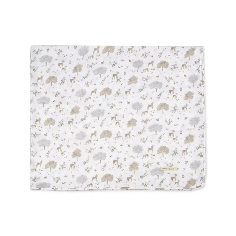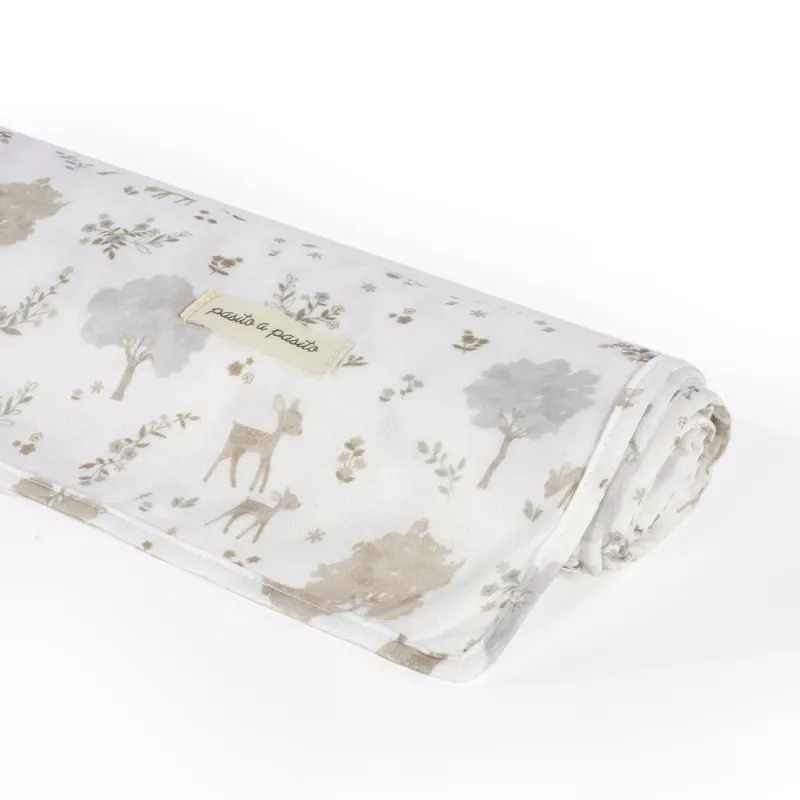 Nara de Pasito a Pasito muselina, tonu neutroko orein eta zuhaitzen estanpazio delikatuarekin, leuna, arina eta oso moldakorra da. Banbuz eta kotoiz egina, haurtxoaren larruazala zaintzen du erabilera askotara egokitzen den bitartean: arrulua, mantita, edoskitzaroko estalkia edo aldagailua. 120 × 120 cm-ko neurri zabala.