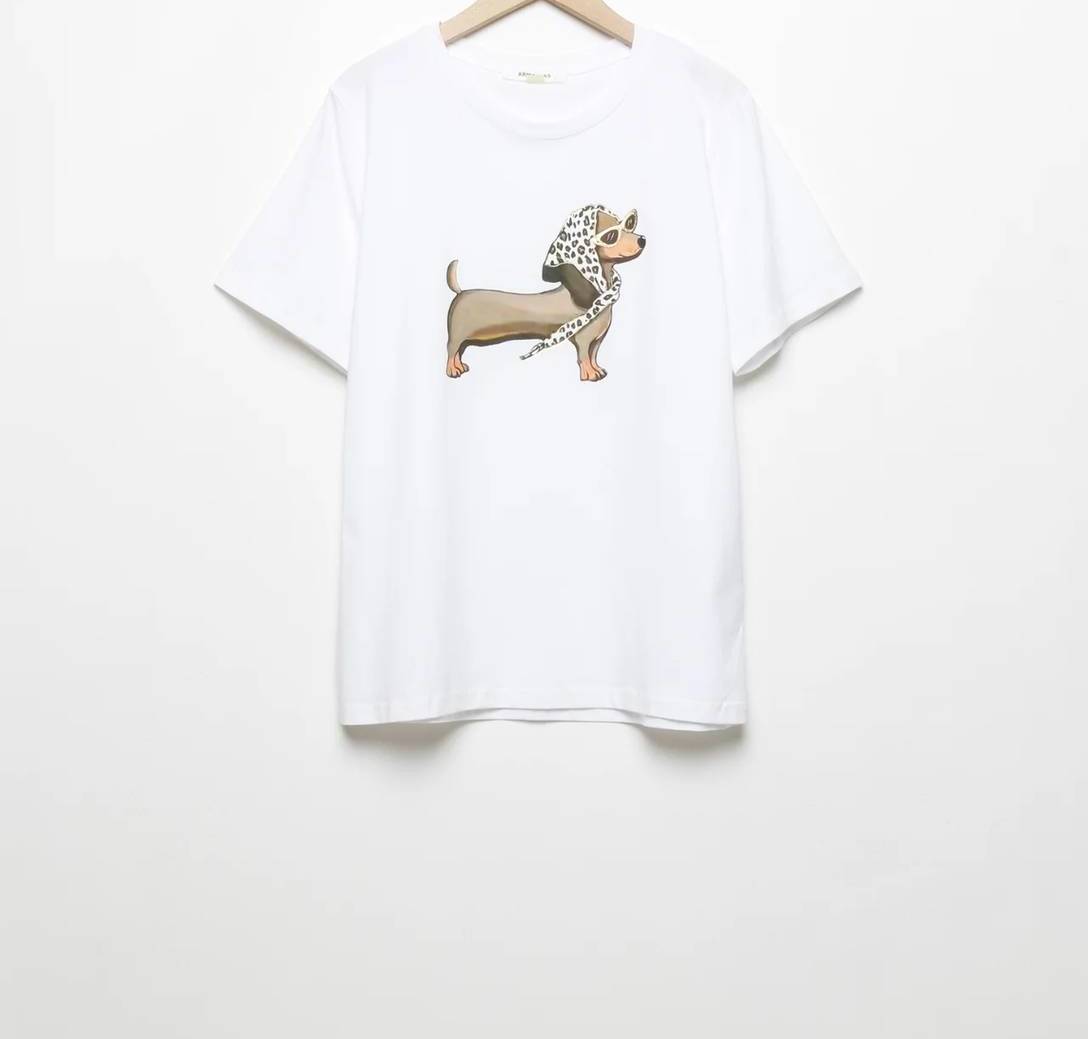 Emakumeentzako oinarrizko kamiseta txuria, lepo biribila, manga laburra, disenu zuzena, ebaketa estandarra txakur saltxitxa marraztuta. Primeran zure tejano edo tirantezko soinekoen azpian eramateko.
