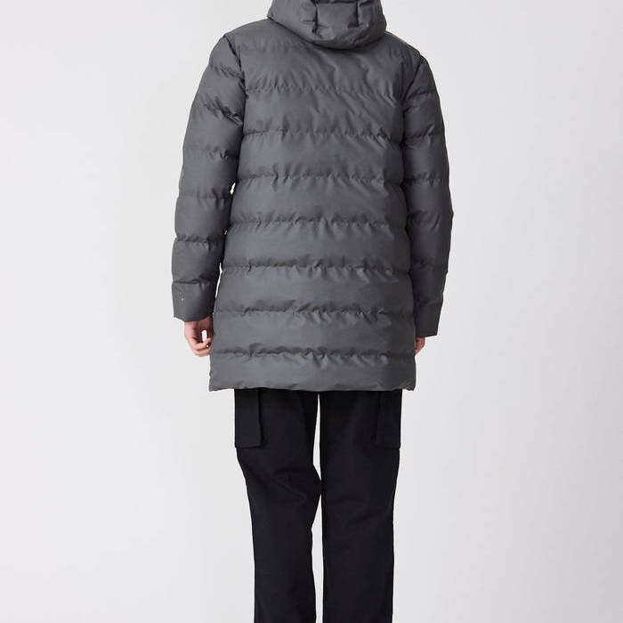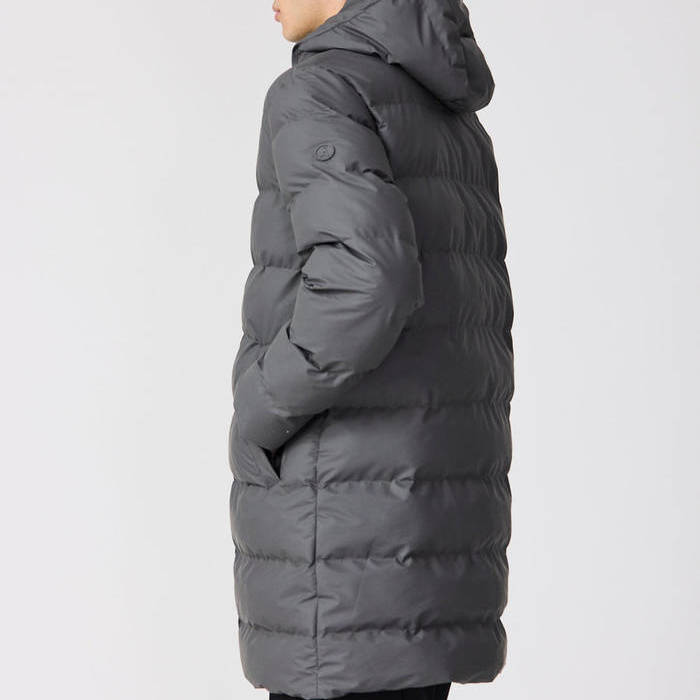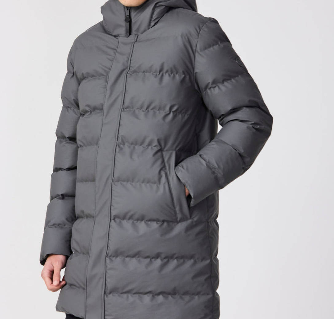 Entre sus detalles destacan una cremallera impermeable de doble cursor con cierres magnéticos ocultos en la tapeta frontal, además de correas interiores tipo mochila que permiten llevarlo cómodamente sin usar las manos. Un abrigo acolchado de diseño depurado, perfecto para los días más fríos y lluviosos.