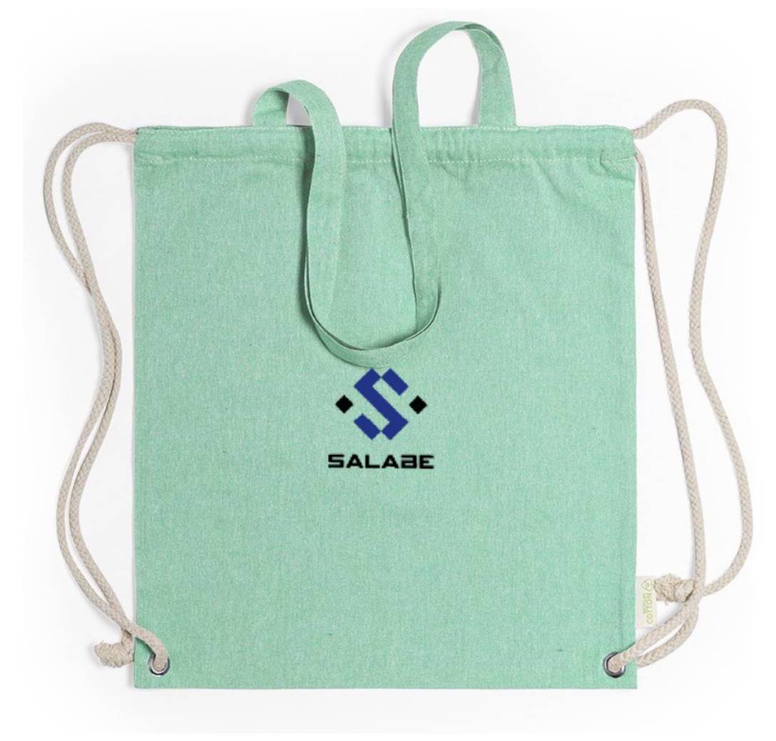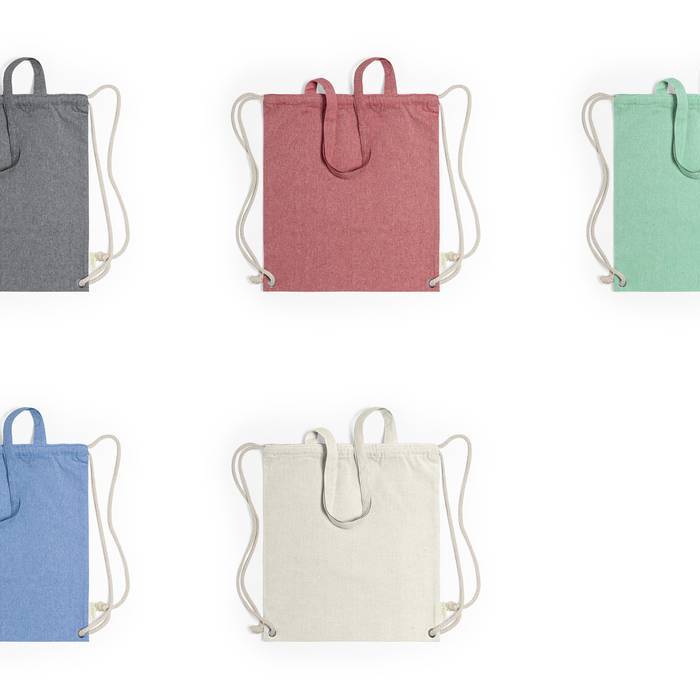 Lokarrizko motxila-poltsa, 140 g/m2-ko kotoi birziklatu erresistentearekin, 70 cm-ko helduleku parekatuekin. Kotoizko lokarriak, metalezko eraztun sendotuekin eta birziklatutako kotoizko etiketa bereizgarriarekin. Kolore sorta zabalean eskuragarri. 9 kg-ko pisura arteko erresistentzia.