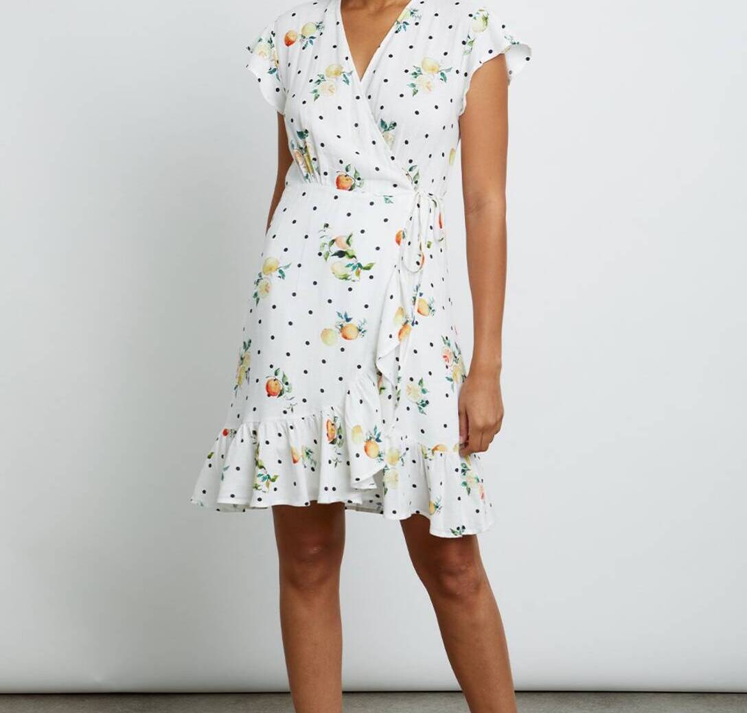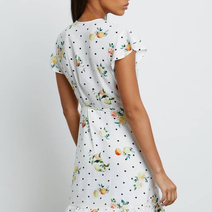 Liho arinezko minibestido gurutzatua, mahuka laburra, ilargi beltz eta zitriko koloreanitzen estanpatuz forratua eta karraskaria, V formako eskotea, mahuka zabalak, gerrian begizta bidez doitu daitekeen gona gurutzatua eta tolesturan bolanteen xehetasuna. Jantzi femenino eta mesedegarri hau ezin hobea da edonorentzat.