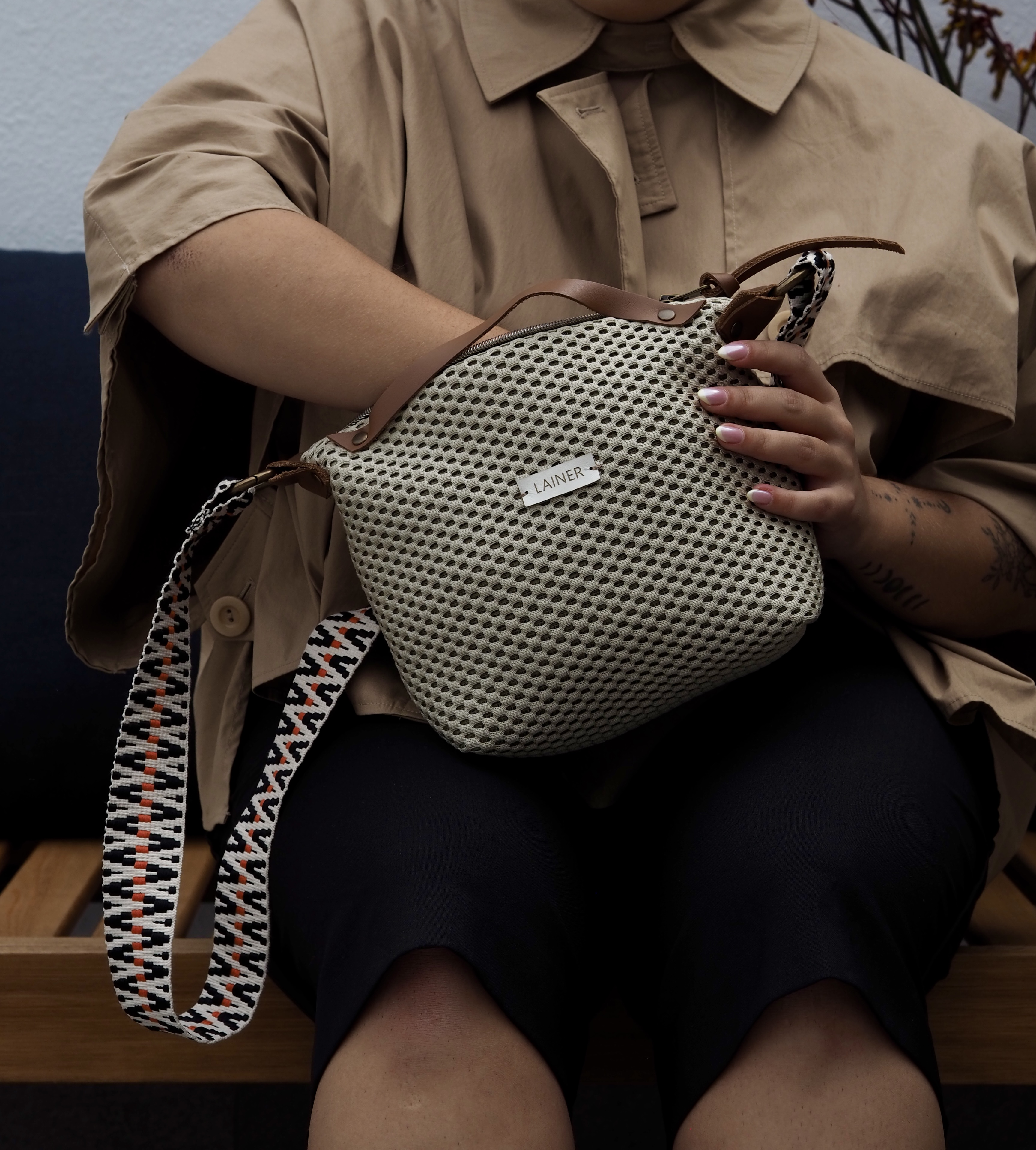 Poltsa bandoleroa, beix koloreko sareta bikoitzeko ehunarekin egina. Oso ehun arina eta erresistentea da, horregatik eta bere diseinu minimalistagatik poltsa hau zure egunerokotasunean eramateko eta edozein look-ekin konbinatzeko aproposa da.