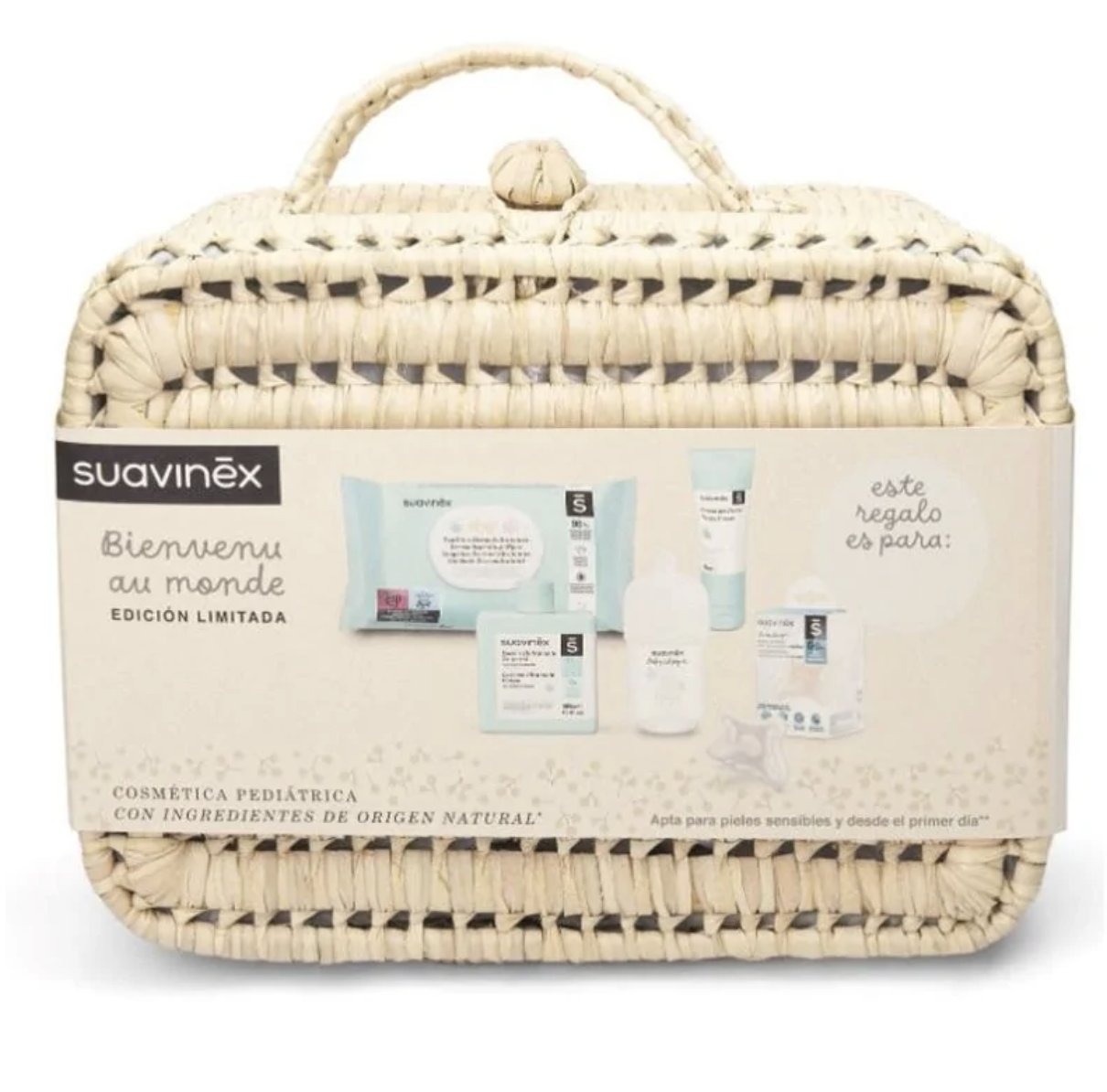 Bienvenido al Mundo de Suavinex izeneko maleta zumezko maleta da, edizio mugatukoa, larruazal sentikorretarako egokia den kosmetika pediatrikoarekin eta lehen egunetik.