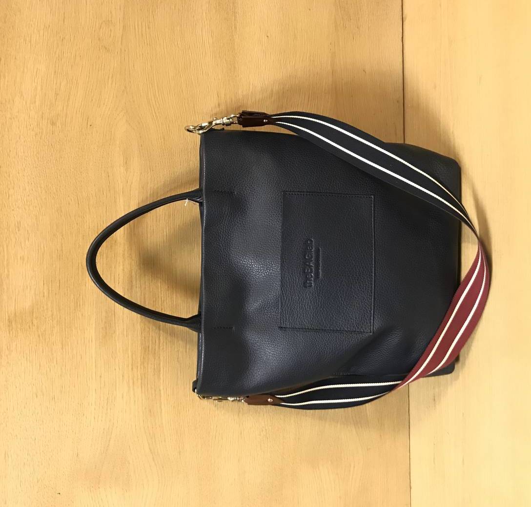 2 heldulekuko behi-larruzko shopping poltsa, itsas-urdin kolorekoa. Imanezko itxitura, barruko poltsikoa eta bi mosketoi dituen marradun bandolera tira du.