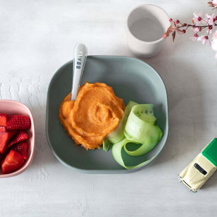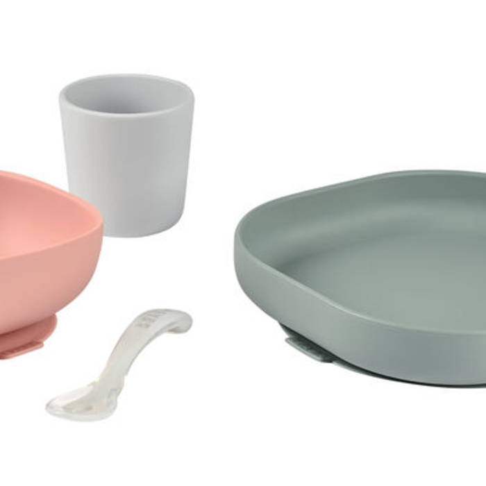 Beabako silikonazko ontziteriak plater bat eta bol bat ditu, bentosarekin, edalontzi bat eta koilara bat 2. adinerako.
