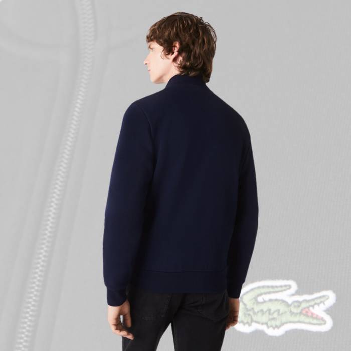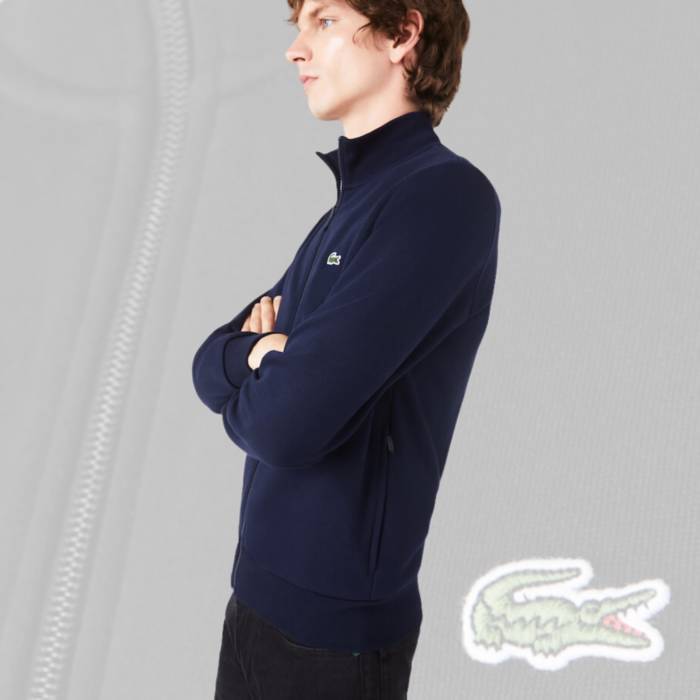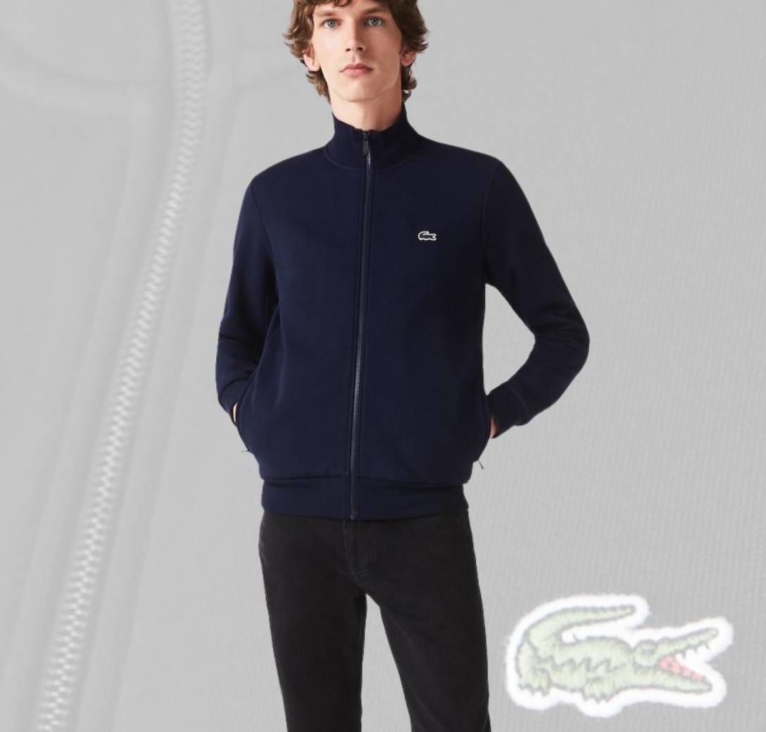 Sudadera Lacoste berria, kremaileraduna, oinarrizko kirol-jantzi bat, kotoizko felpan egina dago. Lepo altu ildaskatua eta ilargi erdi tafetana ditu. Jertse klasikoaren bertsio funtzionala.