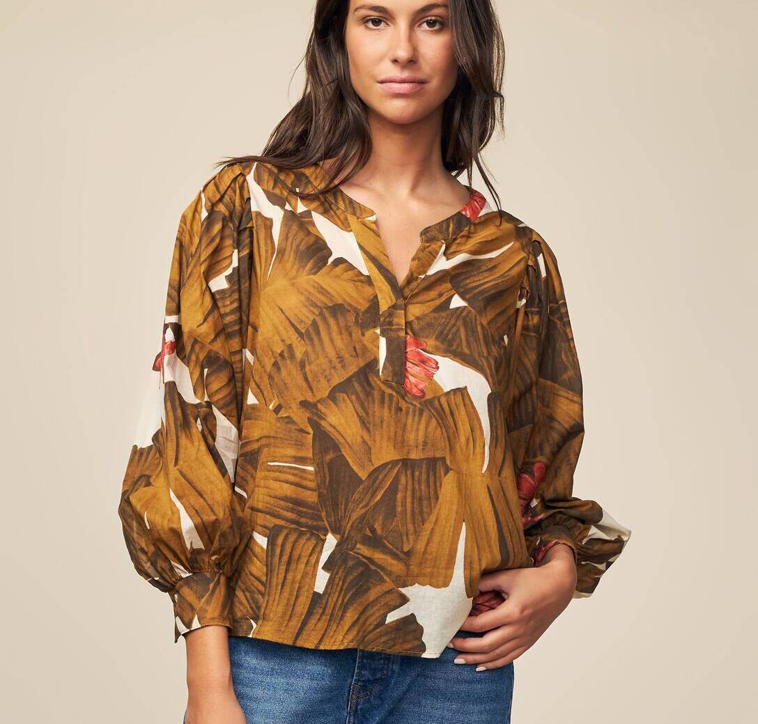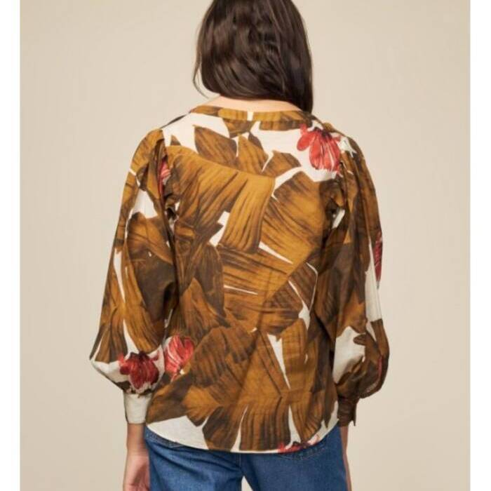 Kotoi finez egindako blusa, (cotton voile) freskoa eta arina. Estanpatu tropikalak gustatzen bazaizu eta zure azkonarrei udaberriko ukitua eman nahi badiezu, hau zure blusa da. Bere tonu okre eta marroiak eta ukitu gorria primeran geratuko dira zure jantziekin.