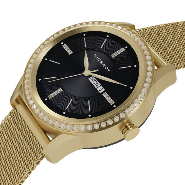 Urrezko IP altzairuzko kaxa, harriekin. Urrezko sarezko altzairuzko eskumuturrarekin, Viceroy segurtasuneko irristailu itxidunarekin. Silikonazko uhal zuri gehigarri batekin dator. 40 mm-ko diametroa duen zorroa dauka. Bost pantaila desberdin ditu. Viceroy smartpro erlojuaren funtzioak: ahots deiak erlojutik bertatik, kronografoa, bizimodu sedentarioa, urrats kontagailua, elektrokardiograma, kalkulagailua, urruneko kamera, pultsazioak, jakinarazpenak, alarma, loaren kudeaketa, distantzia, odol presioa, telefonoaren kokatzailea, kirol kudeaketa, odol oxigenoa, mezularitza, egutegia, musika eta kaloria kontrolatzea.